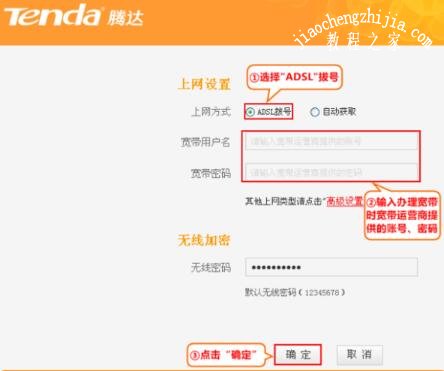 7、选择正确的上网方式进行设置(常见上网方式有PPPOE、动态IP、静态IP三种,此处以“ADSL拔号”为例进行设置,设置页面中选择“ADSL拨号”, 在“宽带用户名”、“宽带密码”中输入宽带运营商(例如:电信、联通等)提供的宽带用户名和密码 ,点击“确定”即可。